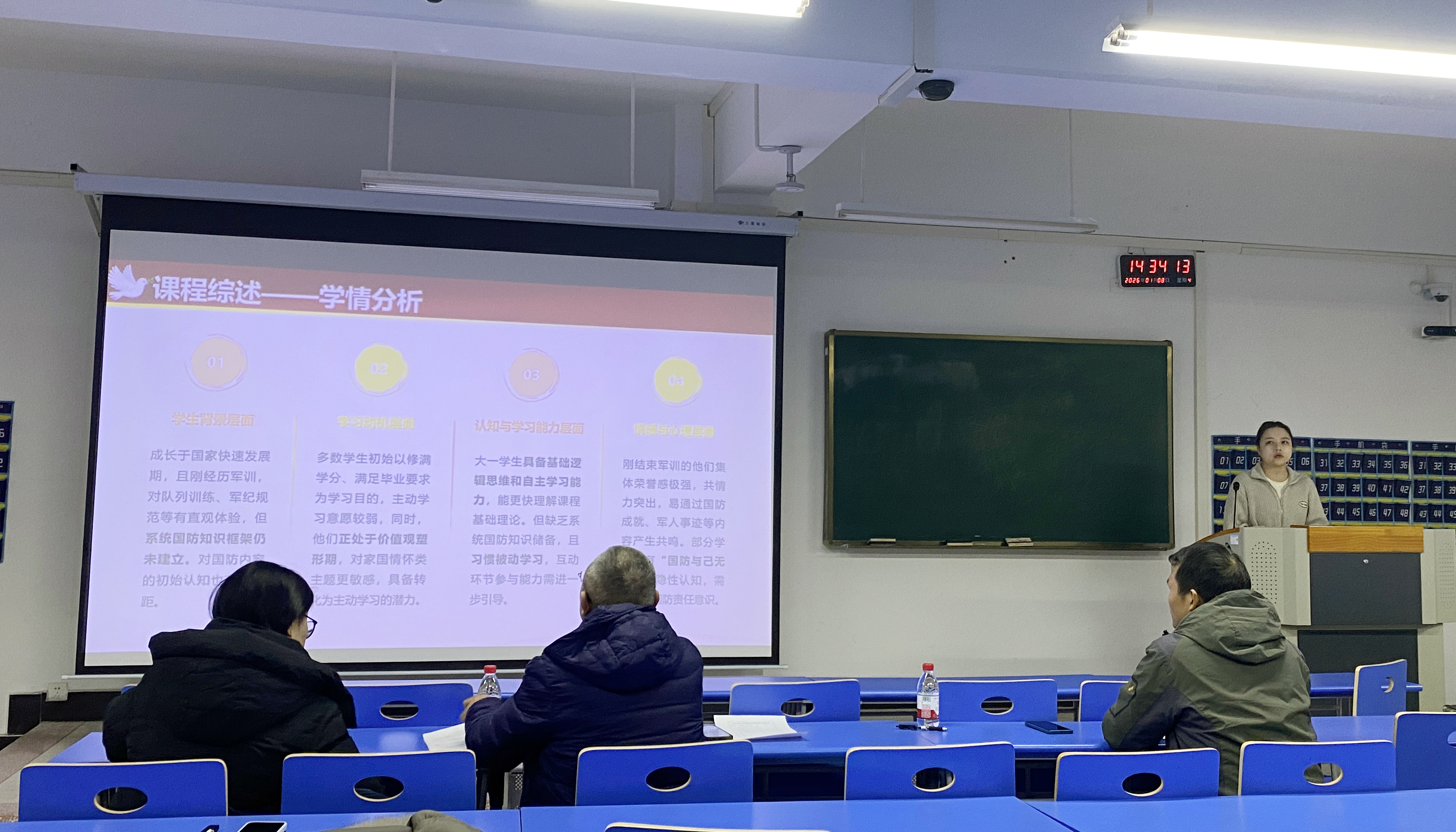 教研室为保障军事理论课教学质量与教学实效,强化课堂教学实践能力建设,1月8日,教研室于03A401教室组织开展了军事理论与国家安全课新教师试讲活动。本次活动特邀校级教学督导周鹏、王含英两位专家莅临指导,教研室多士平老师全程参与评课,共同助力新教师成长。